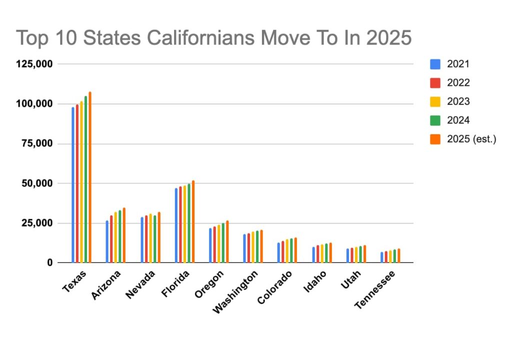 According to a 2024–2025 migration study by MoveBuddha, the top destinations for former Californians are Texas, Arizona, and Florida. A similar report from U-Haul also found that California remained one of the top outbound states, with many one-way rentals bound for Texas, Tennessee, and Colorado (U-Haul Growth Index, 2025).
